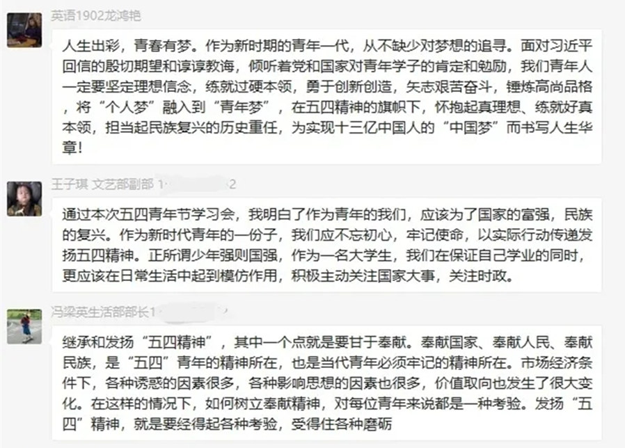 最后由团学干部自由分享学习心得感悟,干部们通过发表自己对“五四精神”的理解,谈及作为当代老员工应该弘扬传承五四精神,用奋斗书写青春,用拼搏成就梦想,努力学习专业知识,扛起时代使命,成为一名有作为的老员工,为中华民族的伟大复兴献出自己的力量,做一个有理想,有目标,有担当的五四青年。