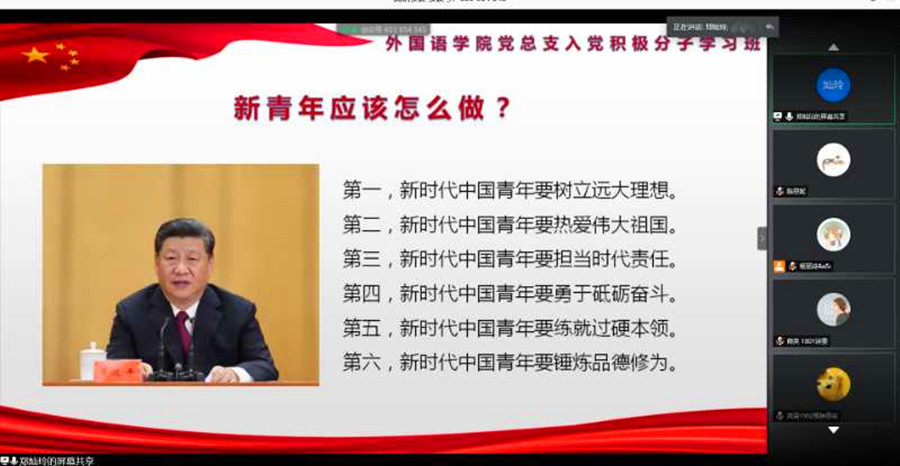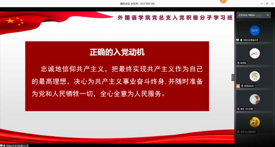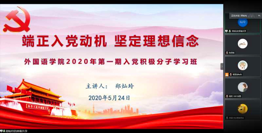 为进一步深入落实“端正入党动机,坚定理想信念”主题教育工作,扎实推进入党积极分子的学习教育工作,5月24日晚19:00,伟德国际1946分党校2020年第一期入党积极分子第三次党课培训于线上顺利开展。此次党课由伟德国际1946校团委副书记郑灿玲主讲,分党校助理教员李若薇同学主持,全体学员参加学习。