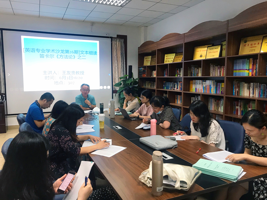 6月3日下午,伟德国际1946在第二行政楼307室举行了第26期英语专业学术沙龙,主题为“笛卡尔《方法论》文本细读之二”,王友贵教授主讲,副经理袁鑫和英语系部分老师参加了此次沙龙。