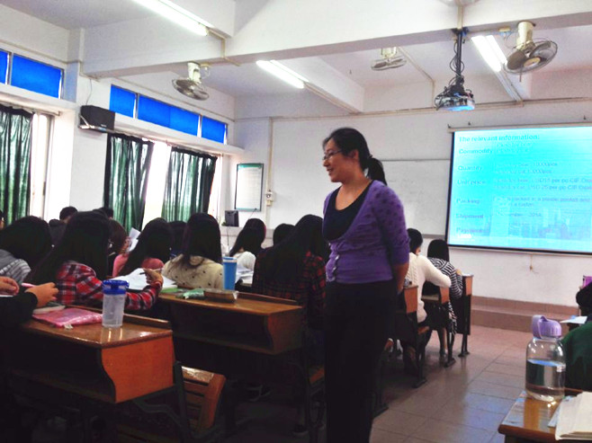李燕老师以任务型教学为主线,通过让员工模拟填写售货合同,运用多媒体课件等多种手段创设了生动有趣的情景,凭借丰富的教学经验,风趣幽默的语言,由浅入深的引导;形成师生互动的效应,课堂气氛轻松愉快。在师生有效互动的过程中,使员工把所观察到的事物运用准确的语言表达出来,员工在不知不觉完成了售货合同。全体听课教师都十分投入。可以说这节课上得“简单、高效”。此外,李老师还批改员工所做的课堂笔记,在课堂上展示员工的优秀笔记,这一环节很大程度上强化了商务英语专业员工的记忆。