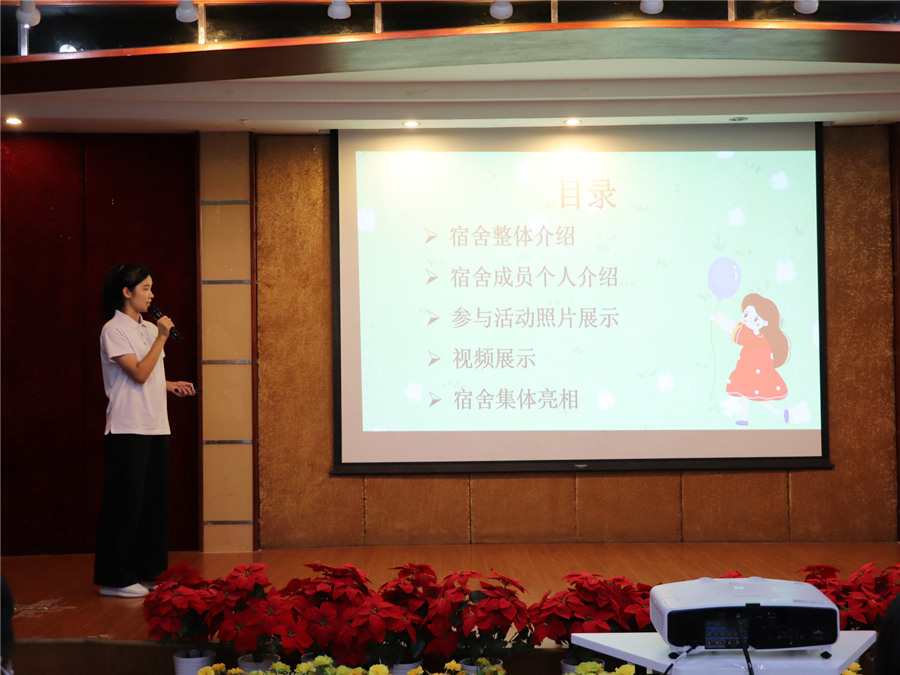 本次决赛分为三大环节。第一环节为PPT展示,即各宿舍代表通过PPT来介绍宿舍成员、规章制度和文化建设等内容;第二环节为宿舍小视频播放,即通过视频展示各宿舍和谐的日常学习与生活面貌;第三环节为宿舍集体亮相,宿舍成员们可用自我介绍、才艺表演的方式上台亮相。主持人对此次大赛的规则进行简单的介绍后,各参赛队伍展开了激烈的角逐。围绕“和谐”这一核心要素,每支参赛队伍都用制作精美的PPT展示、创意十足的视频呈现和妙趣横生的集体亮相,赢得了评委和观众们的阵阵掌声,展现了和谐友爱、互帮互助的宿舍氛围,体现了广商学子在日常学习与生活中乐观向上、积极进取的精神面貌。