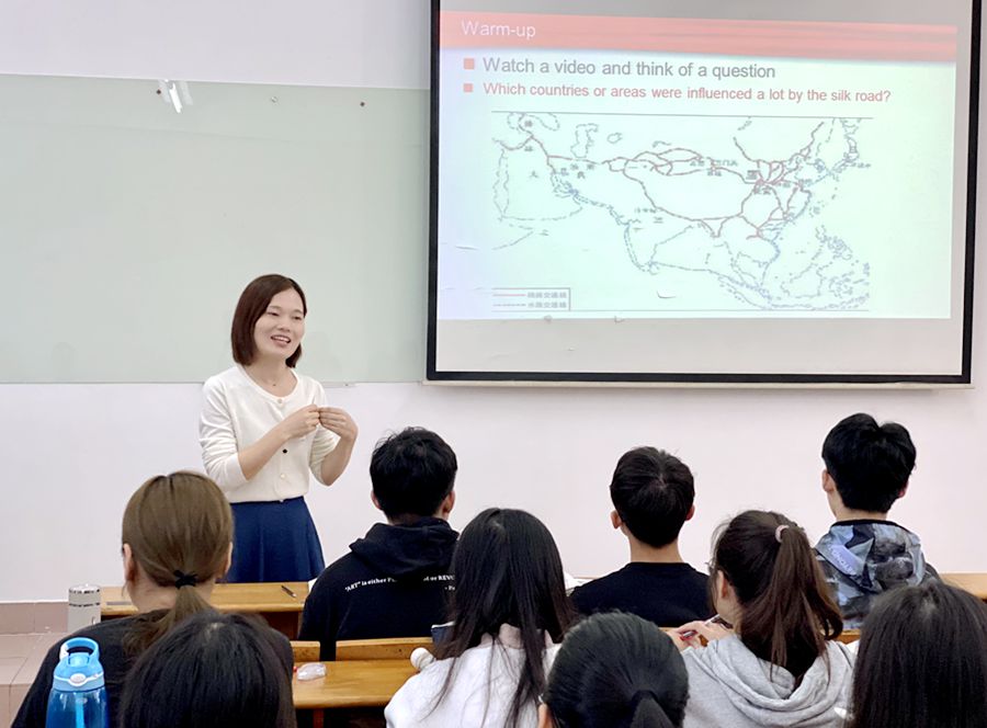 本场研讨课为18级英语专业课程“中国文化概论(英语)”,主讲老师为毛文秀老师,讲课主题为 “中国丝绸之路”。毛老师在课程开始时先向员工简要概述了本课教学目标和教学内容,接着用一段视频,引出本次课程的主要内容——“丝绸之路”。 毛老师先是让同学们快速阅读课文内容,再结合视频,采用问题引导的方法,逐步引导员工了解古代和现代关于丝绸之路对中国乃至世界的影响,并理解中国政府提出“一带一路”倡议的战略意义和文化意义。毛老师全程用英语进行讲授,教态自然,语速平稳,课程设计流畅,教学环节紧凑,教学内容丰富,教学效果良好。