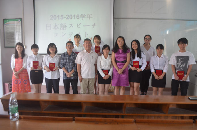 近日,我系日语教研室主办,日语协会承办的2015-2016学年日语演讲比赛在教学楼c404隆重举行。我系党总支书记徐超,日语教研室主任张烈副教授出席本次比赛,邓亚晔、黄小英及日语外教石桥谦一老师担任比赛评委。