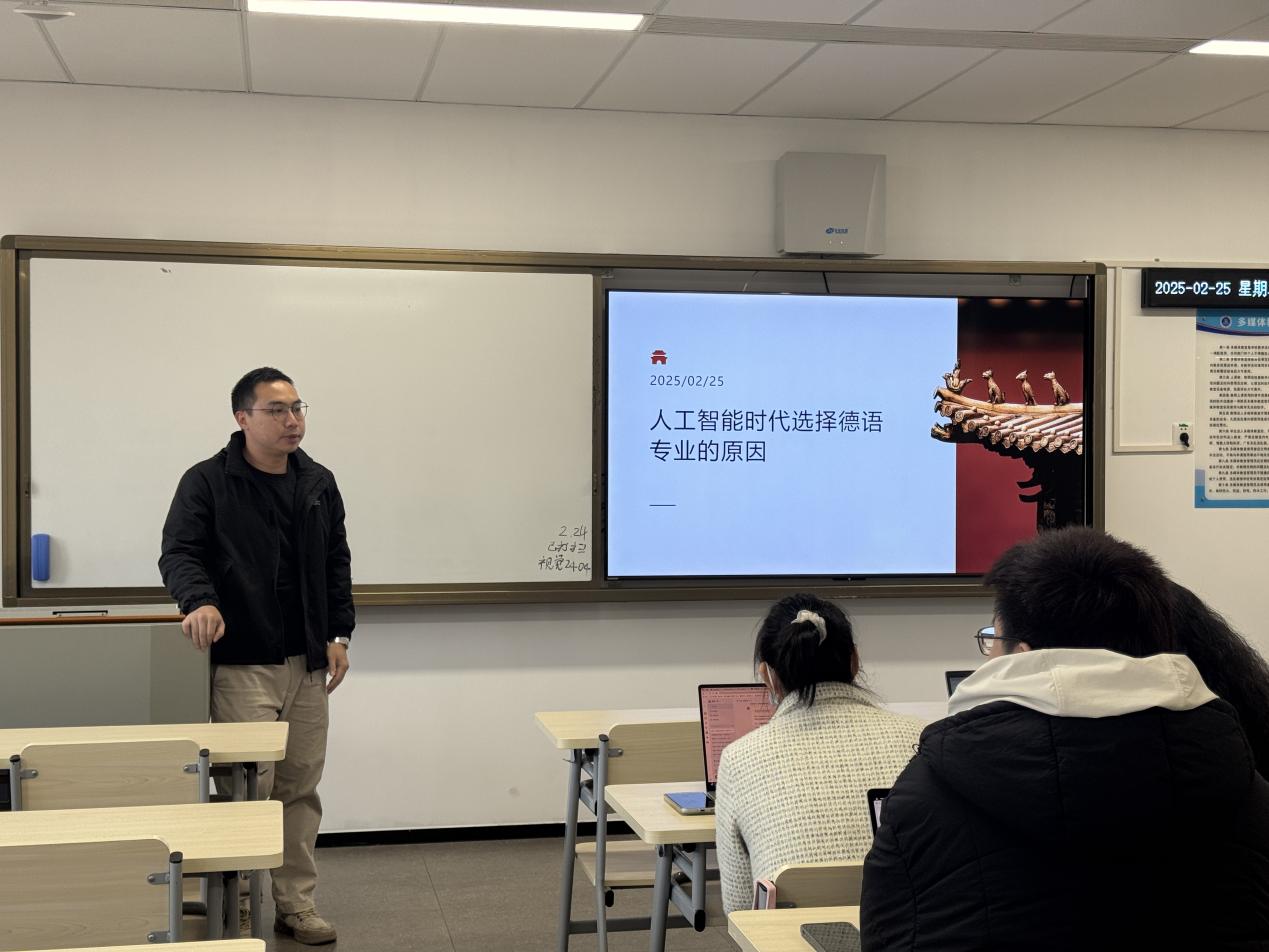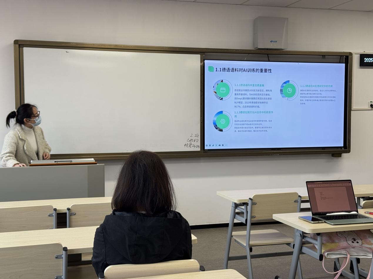 在会议的第二部分,德法系老师们以“人工智能时代德语专业的机遇与挑战”为主题展开热烈讨论。章睿霖老师提出了 AI 时代选择德语专业的六大核心优势,如 AI 技术研发中德语作为科技文献语言的战略价值、人机协作时代德语专业员工凭借文化理解力和专业协同优势的独特地位、中德科技合作中德语人才的桥梁作用、复合型人才培养展露新路径、数字人文方向为升学提供的新思路以及职业发展新赛道等,这些优势为德语专业的未来发展提供了广阔的前景和方向,也为老师们在教学和员工培养方面提供了新的思路。