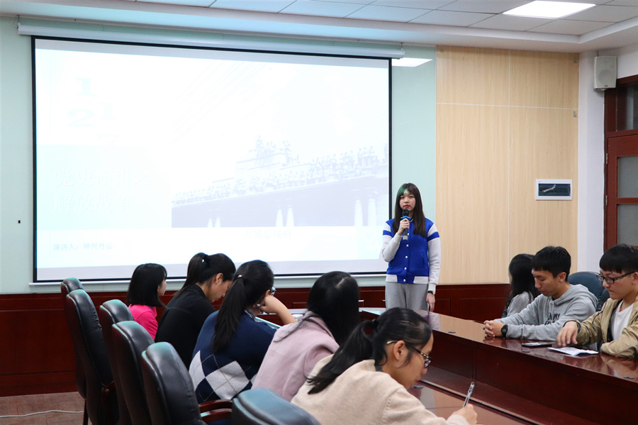 周晓敏同志以1921年浙江嘉兴南湖的那艘“红船”为切入点,介绍了中国共产党的诞生,从此在中国出现了一个完全崭新的,以马克思列宁主义为其行动指南的,统一的无产阶级政党,中国的革命从此焕然一新。黄韵婷同志解说的图片主题为1923年 “中共三大”,她向与会的成员介绍了中共三大召开的背景及意义,本次会议促进了第一次国共合作的实现,使共产党活动的政治舞台迅速扩大,加速了中国革命的步伐,为波澜壮阔的第一次大革命作了准备。方梓满、蔡诗雯和刘建兴同志以1935年召开的遵义会议为主题,介绍了在红军第五次反"围剿"失败和长征初期严重受挫的情况下,为了纠正博古"左"倾领导在军事指挥上的错误而召开的。这次会议是中国共产党第一次独立自主地运用马克思列宁主义基本原理解决问题的路线、方针政策的会议;也正是在这次会议上确立以毛泽东为代表的马克思列宁主义的正确路线在中共中央的领导地位,挽救了党、挽救了红军、挽救了中国革命,是中国共产党历史上一个生死攸关的转折点。钟何丹云同志以南京解放,占领总统府为中心,介绍1949年我军乘胜追击,奋勇前进,坚决、彻底、干净、全部地歼灭中国境内一切敢于抵抗的敌人的决心,为新中国的建立立下赫赫战功……经过紧张激烈的比拼,最终刘建兴与陈冰并列获得一等奖,周晓敏、钟何丹云及陈婷获得二等奖,李若薇、沈文媚、王紫雨获得三等奖。