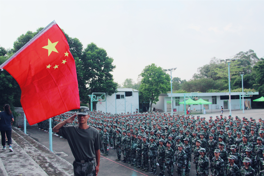 军事训练场上,在教官铿锵有力的口令声中迅速集结,全体师生统一面向国旗,在缓缓响起的音乐声中,大声高唱“起来!不愿做奴隶的人们!把我们的血肉筑成我们新的长城……”。高亢的国歌同唱,不仅唱出新生们为祖国母亲七十周年华诞致敬献礼的殷切呼声,也抒发对祖国母亲的无限热爱。随后,全体新生团员对着国旗行注目礼,时空定格在教官向国旗敬礼的一瞬,简单的动作,饱含的是广大青年不畏艰难,捍卫祖国荣耀,拥护共产党领导全国人民走向胜利的决心。紧接着不少新生结合自己的学习和生活,先后围绕“老员工应如何当好护旗手”发表了自己的想法和见解,抒发了深深的爱国荣校情怀。活动尾声,刘老师寄语全体新生要发扬艰苦奋斗的精神,担当起当代青年的神圣使命,把理想化为宏图,把计划付诸行动,展现风采,奉献智慧,与祖国共奋进,和祖国共拼搏,同祖国共进步。