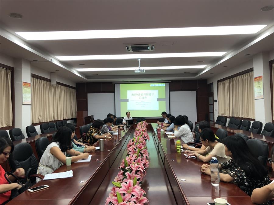 莫爱屏在讲座中鼓励老师们要多出科研成果。他认为,做什么研究并不要紧,要紧的是要有科研意识,有了科研意识,再从时间、空间、选题这三方面慢慢实现自己的科研之路。莫爱屏分别从学会观察、把握方向、准备条件、确定题目、合理设计、写作与发表这六个方面谈教师科研意识的培养。他对研究方法、应用工具、科研资源、成果形式确定、成果去向定位等进行了分类,并指导在场老师们制定研究计划,与老师们分享自己选题的思路、技巧以及方法。莫爱屏特别贴心地提醒老师们投稿前的一些注意事项,为老师们推荐了一些关于科研方法、统计方法的参考书目,在场老师们收获颇多。在互动交流环节,老师们踊跃地提出自己在科研上的一些困惑,莫爱屏的回答提纲挈领,在场老师们纷纷表示受益匪浅。