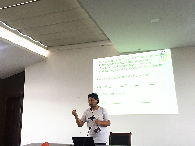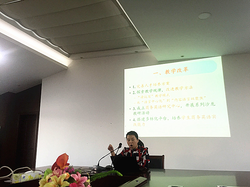 德语系的邓光远老师提出“以演促学”的新方法,让员工在自觉和不自觉的表演中习得外语,同时通过开展创意听写等活动提高员工的学习兴趣。日语系的罗玉玲老师采用了“以译促学”的新模式,让员工从大一开始有计划第进行翻译练习,提高自己的语言运用能力。大学英语教研室的李卓华老师则是在专门用途英语教学方面介绍了自己的经验,并提出了教师发展的新思路与新方向。基础英语教研室的张首翔老师介绍了如何利用认知语言学研究成果提高教学效果的尝试。随后伍彩芬老师为大家介绍了商务英语教学与科研相结合的经验,为老师们的长远发展提供了新途径。最后王秋瑶老师从员工的提问“讲课文有用吗”开始,以目标和兴趣为导向,改革了课文教学方法和词汇教学方法,取得良好效果。