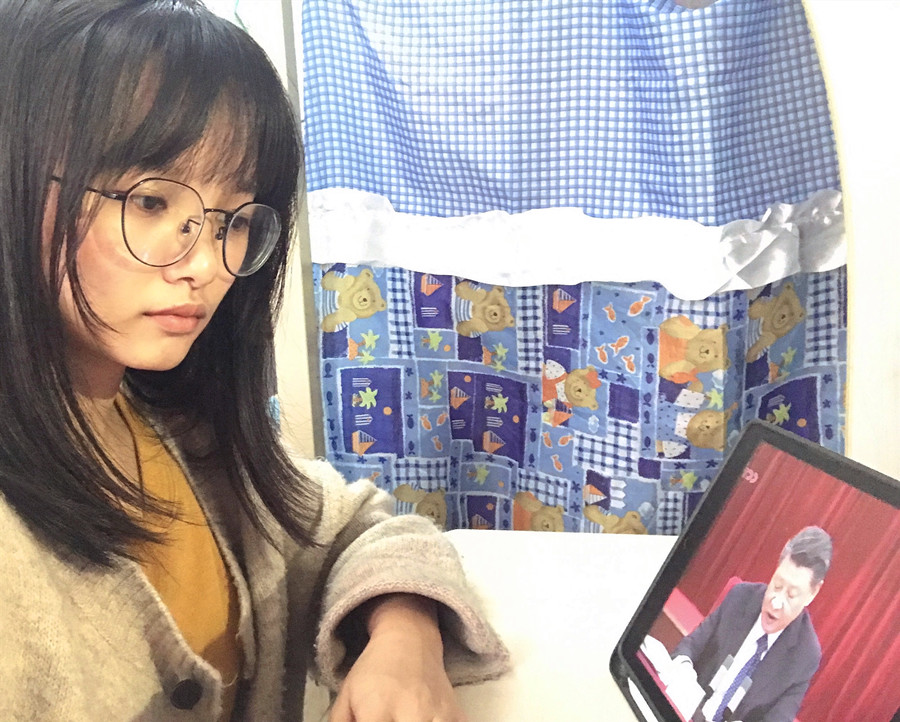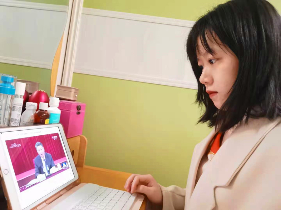 公司17级员工党支部员工党员蒋楚婷在认真聆听习近平总书记讲话