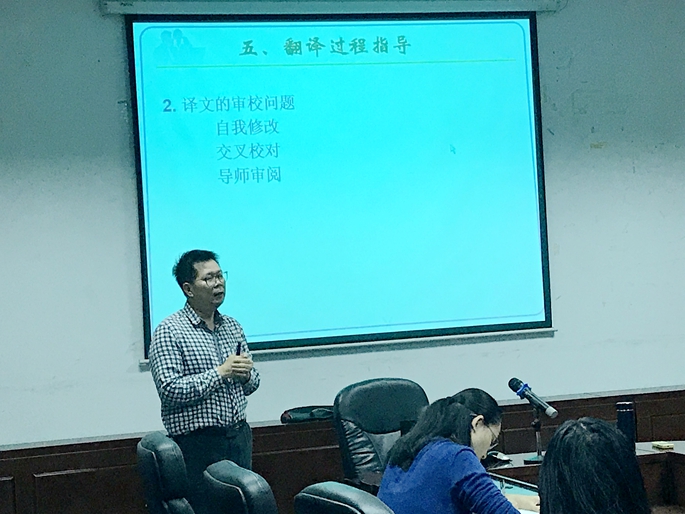 黄国都老师就“翻译实践报告”的写作要求分别为教师和员工进行了简明的分析和扼要的阐述,重点强调了翻译实践报告的性质和作用,详细地解说了翻译实践报告的基本要求与框架,以及选题、撰写计划书和报告的格式规范和要求。程瑜瑜老师则为教师和员工就文学方向学术论文的写作要求进行了详细地讲解,详细阐述了文学论文的选题范围和写作过程的要求,指出了如何进行应用型研究,强调了论文文本的研究方向和理论方法的选择的重要性。