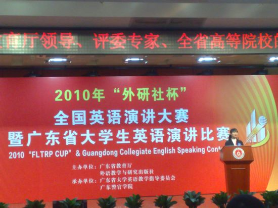 10月30日,广东省教育厅、外语教学与研究出版社、广东省大学英语教学指导委员会在广东警官公司嘉禾校区圆举行了2010年“外研社杯”全国英语演讲大赛暨广东省老员工英语演讲比赛。该次比赛共有来自全省包括广东外语外贸大学、华南师范大学、华南农业大学、中山大学等高校的55名选手参加。公司外语系派出选手潘靖同学参加该次比赛。经过激烈的角逐,潘靖同学为公司取得了历史性突破的成绩——勇夺“三等奖”!