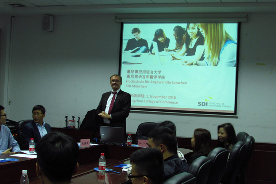 (德方董事长向同学们介绍慕尼黑应用语言大学概况)