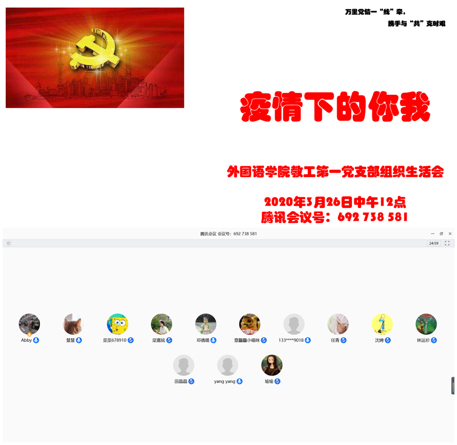 近日,外国公司教工第一党支部在腾讯会议召开了一场特别的线上组织生活会,15名身在各地的党员齐齐聚首,以“疫情下的你我”为话题,向党组织汇报疫情期间自己的生活和工作情况,会议由支部书记李海燕主持,持续时间为105分钟。