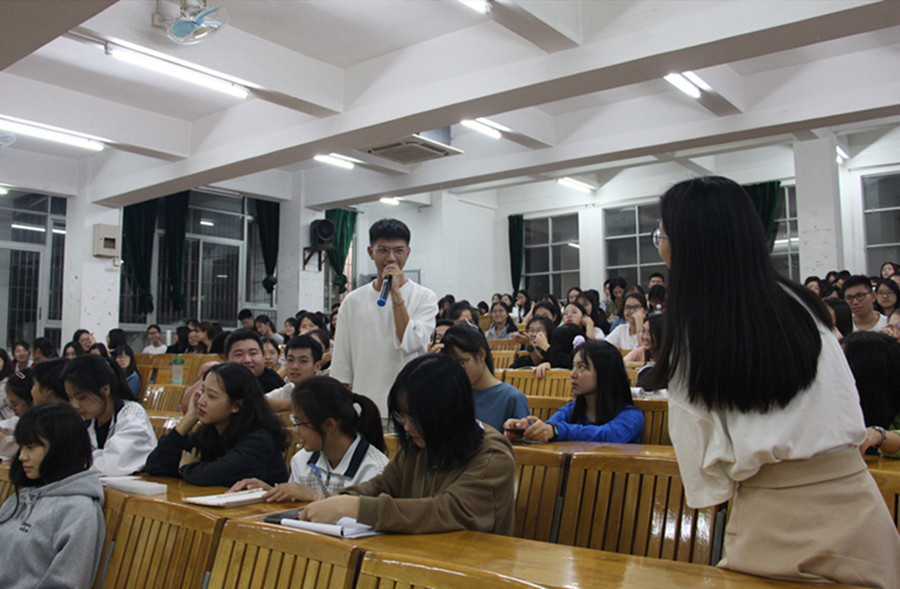 承接专题片中的关键词“初心”、“使命”,郑灿玲老师与在场干部进行互动:“担任员工干部的初心是什么?使命是什么?”她结合当前“守初心、找差距、担使命、抓落实”的总要求一一阐述,分享了自己的见解。她以“五个一”为标准向全体干部提出了要求,即“一颗心、一个头脑、一张嘴、一支笔、一双腿”,希望各位干部能提高政治站位,做好日常基础工作,学会统筹兼顾,及时总结反思,提升自身素质,发挥引领作用。随后,英语1701等班团干部代表就日常工作案例经验与在场干部展开交流,分享心得要点。
