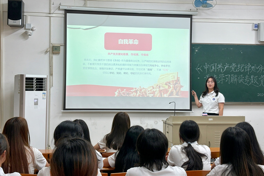 为深入贯彻习近平总书记关于党纪学习教育的重要指示精神,切实加强党支部的纪律建设,不断增强党支部成员学纪、知纪、明纪、守纪的纪律自觉。伟德国际1946员工第二党支部于5月14日20:00在第六教学楼305室开展《中国共产党纪律处分条例》重点学习解读专题党课,参与本次专题学习的有伟德国际1946员工第二党支部书记谢敏丽、22级英语专业辅导员陈钰洵、22级商务英语专业辅导员庄菲菲及党支部成员代表们。