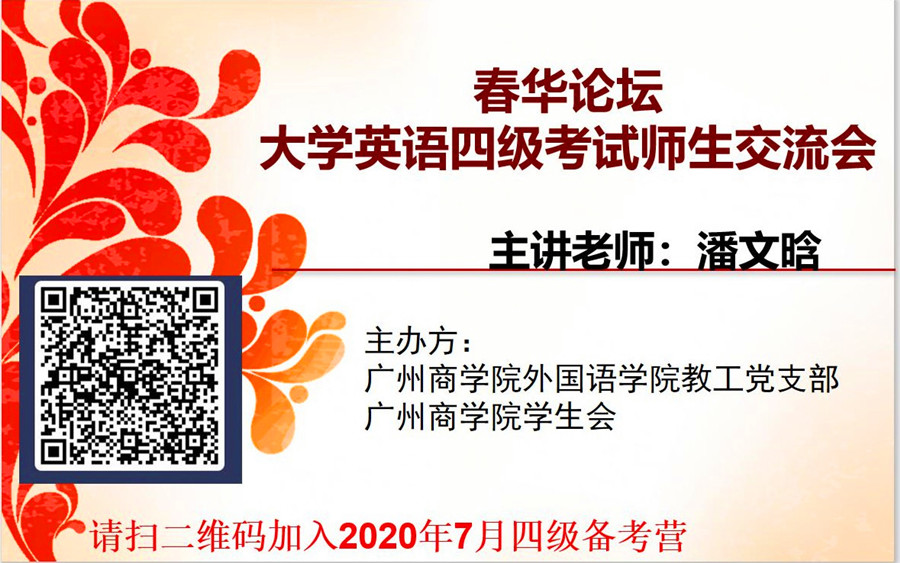因为疫情的影响,公司原定于2020年6月大学英语四级考试延期到9月19日举行。为帮助同学们提高英语综合应用水平,做好大学英语四级的备考工作,伟德国际1946教工党支部、校员工会于2020年7月14日通过“腾讯会议”和“速课堂”平台举办了春华论坛系列之大学英语四级考试经验交流会。公司党总支委员、教工第二党支部书记潘文晗老师担任主讲老师,经济公司罗正、郑雅叠同学担任嘉宾。全校近700位同学通过两个平台参加了本次师生交流会。