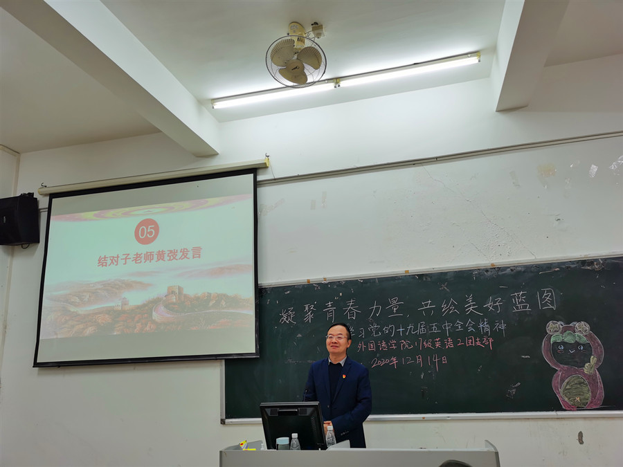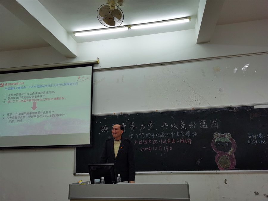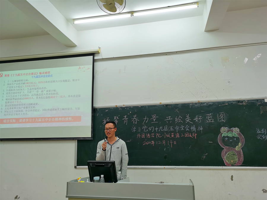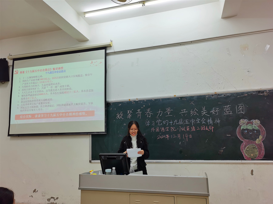 为全面贯彻党的十九届五中全会精神,深入理解党和国家事业取得的非凡成就,领悟习近平新时代中国特色社会主义思想的实践伟力,伟德国际194617级英语2团支部于12月14日19时30分在四教110召开“学习党的十九届五中全会精神”主题团日活动,与会嘉宾有结对子老师黄弢董事长、公司党总支徐超书记及17级英语专业辅导员刘丽老师,活动由团支书林晓莉主持。