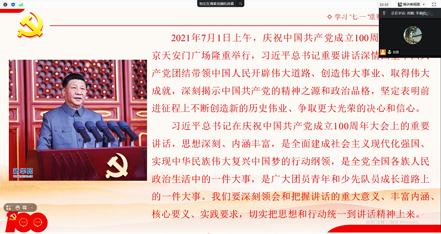 会议开始,党支部副书记刘丽介绍了今天党支部召开组织生活会的主要内容是学习7月1日上午习近平总书记在北京天安门广场为庆祝中国共产党成立100周年大会上的重要讲话。 “一百年前,中国共产党的先驱们创建了中国共产党,形成了坚持真理、坚守理想,践行初心、担当使命,不怕牺牲、英勇斗争,对党忠诚、不负人民的伟大建党精神,这是中国共产党的精神之源。”过去一百年,中国共产党向人民、向历史交出了一份优异的答卷。现在,中国共产党团结带领中国人民又踏上了实现第二个百年奋斗目标新的赶考之路。刘丽也向其他同志推荐“觉醒年代”、“1921”等优秀的献礼影视剧,希望我们能够从中学习,获得新的体会,同时表示对于李大钊同志等的致敬。