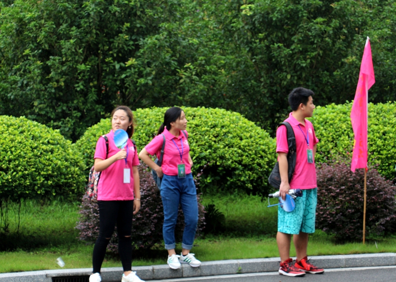 在中国,红色是一种吉祥的颜色,它寓意着吉祥、喜气、热烈、奔放和激情,看到红色,就让人感受到了热情、活力和意志力;漫步在广商的角落,看到身穿品红颜色polo衫的员工,很多人总会情不自禁地多一眼,他们是广商花园中的艳丽花朵,他们是活跃在校园里的伟德国际1946的干部们。今天,他们再次成为迎新人流中的焦点。