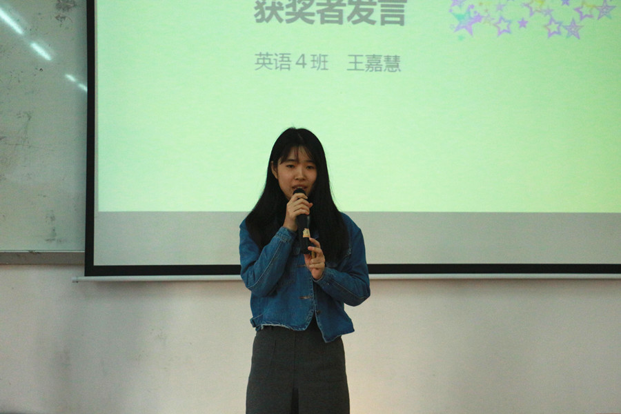 活动伊始,袁鑫为活动致辞,他总结了2016级商务英语专业和英语专业员工在本次大赛的参赛情况,也肯定了比赛的成绩。自今年9月26日至10月26日举办以来,本次比赛得到了公司2016级师生们的关注与支持,参与人数达600多人,形成了广泛的影响力。大会为在本次比赛中获得优异成绩的2016级英语4班王嘉慧等12名同学颁奖。王嘉慧同学作为一等奖获得者为同学们分享了参赛心得,她提出在英语口语锻炼中“勤能补拙”的学习态度,她认为“勇于挑战”是不断提高自己的秘笈。