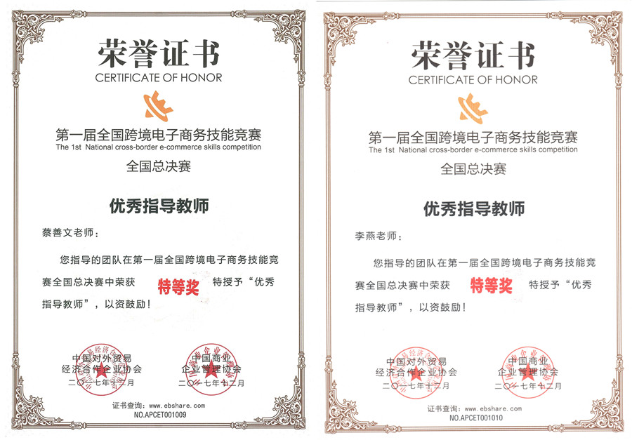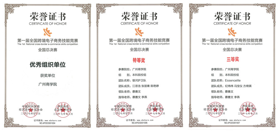 12月27日,由中国对外贸易经济合作协会和中国商业企业管理协会联合主办的的第一届全国跨境电子商务技能竞赛全国总决赛在广州落下帷幕。在指导老师蔡善文老师和李燕老师的带领下,伟德国际1946员工团队银河护卫队(团队成员:江思浩、张丽青、陈艳婷)和Essencelite (纪纬纬、冯宝仪、方绮琪)在比赛各环节表现优异,分获本科组特等奖和三等奖,公司也获得了“优秀组织单位”称号。