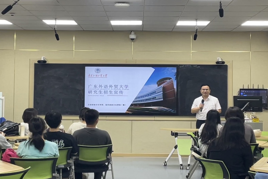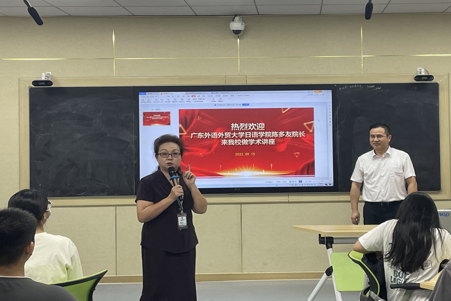 为响应日语系员工考研热情,9月15日上午,广东外语外贸大学日语语言、亚非语言文化公司(筹)陈多友经理应邀为我系大四学子开展日语考研专题讲座。本次讲座由刘小姗教授主持,在轻松、愉悦的氛围下圆满结束。