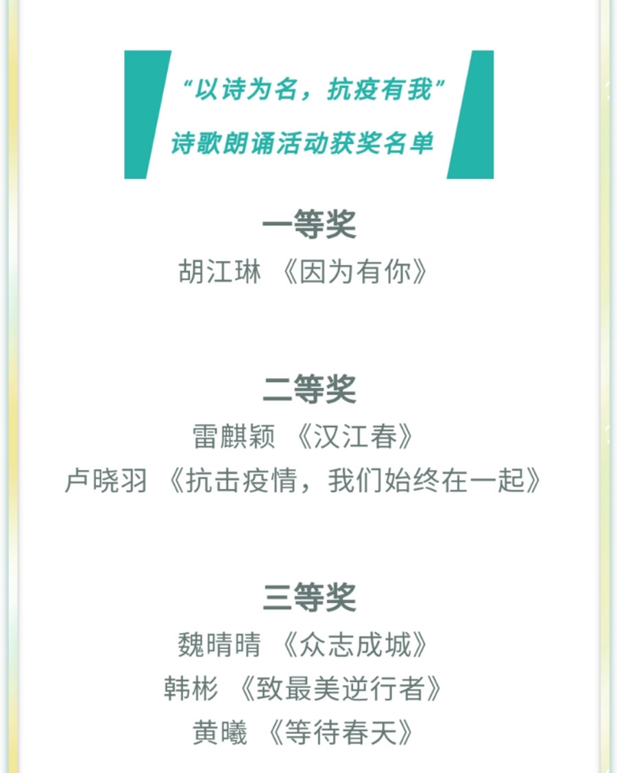 疫情面前,人人有责。本次活动,不仅鼓励了同学们以积极向上的精神面貌参与到疫情防控工作中,为抗疫行动加油助威,也丰富了同学们的居家生活,为同学们搭建了展示自我才华的线上平台,大家以铿锵有力的声音,饱含深情的朗读,表达对抗疫英雄的赞美与敬意,展示出公司学子共同抗疫的坚定信心。