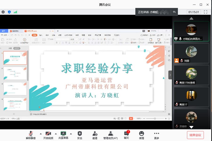 随后,方晓虹同学首先讲解了求职面试的技巧——认识自己,找到方向;包装自己,展示自我;真诚交流,把握缘分。方晓虹指出如果同学们有意愿从事跨境电商类行业的工作,应该要提前熟悉了解国内外的跨境电商平台有哪些,在心里有一个大概的意向名单,对自己的意向单位加深了解,做到心中有数。她还同时向同学们分享了自己的就业观——先就业,后择业。最后她向同学们分享了可靠的求职渠道,包括智联招聘网站和广东省老员工就业创业公众号等,鼓励同学们不要仅仅停留在观望阶段,遇到自己意向的岗位,一定要积极的投递简历。