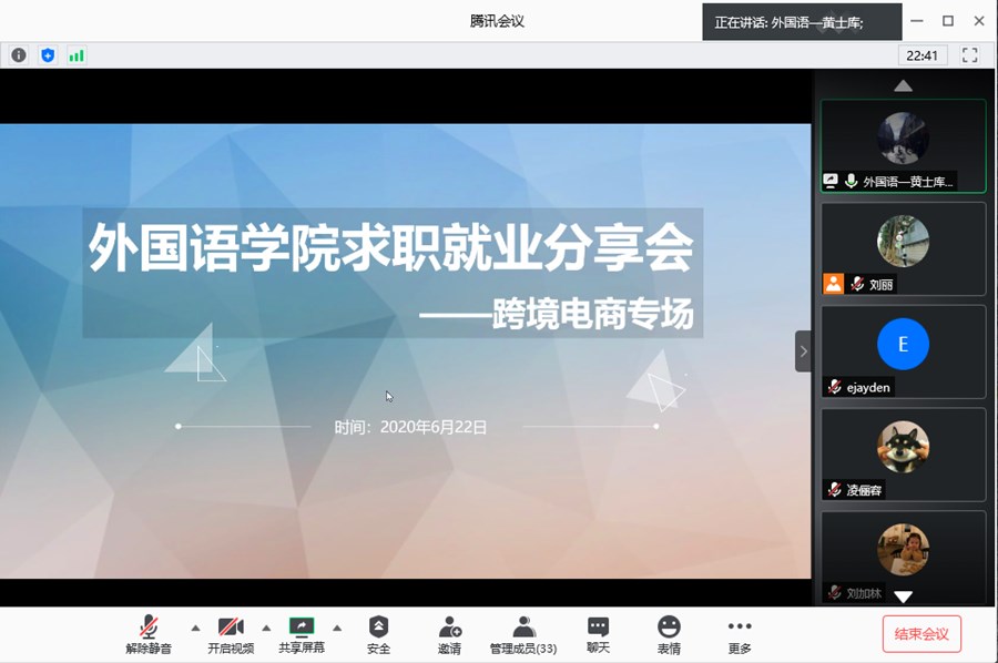6月22日晚上8:00,伟德国际1946跨境电商专场求职就业分享会在腾讯会议平台正式举行。本次分享会邀请了两位16级从事跨境电商类的同学为我们分享她们的工作心得与收获,她们分别是广州汇诺信息咨询有限公司跨境电商德语专员潘毓婵和广州帝康科技有限公司亚马逊运营专员方晓虹。公司党总支书记徐超及17级、18级、19级的员工前来参加此次就业分享会,会议由17级辅导员黄士库主持。