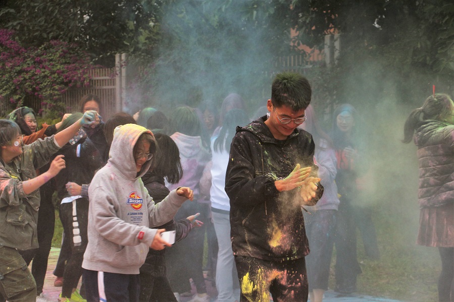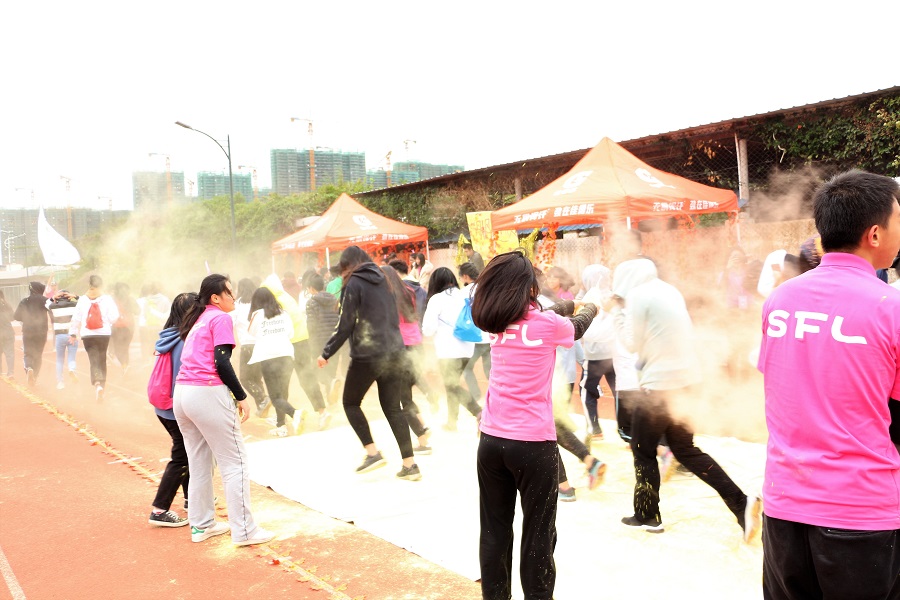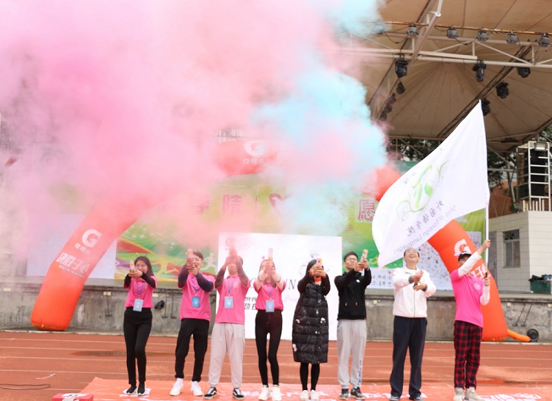 在热烈的掌声中,徐超与领跑员工代表进行院旗交接仪式。伴随彩色礼炮的响起,彩跑正式开跑。同学们依次冲过了起跑线,快乐地向前奔跑,共同领略四季的变换。
