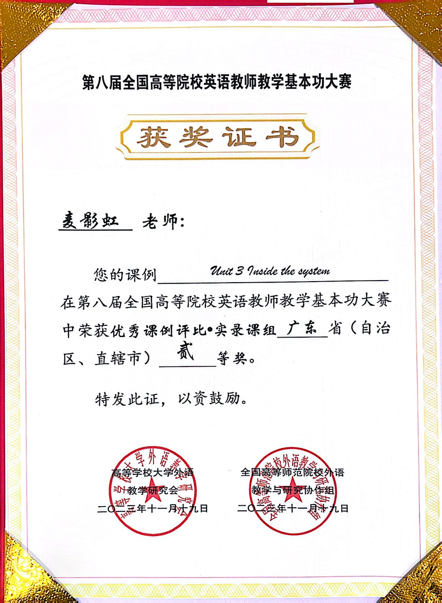 近日,第八届全国高等院校英语教师教学基本功大赛在浙江工业大学圆满落幕,公司伟德国际1946麦影虹老师荣获实录课组省级二等奖。