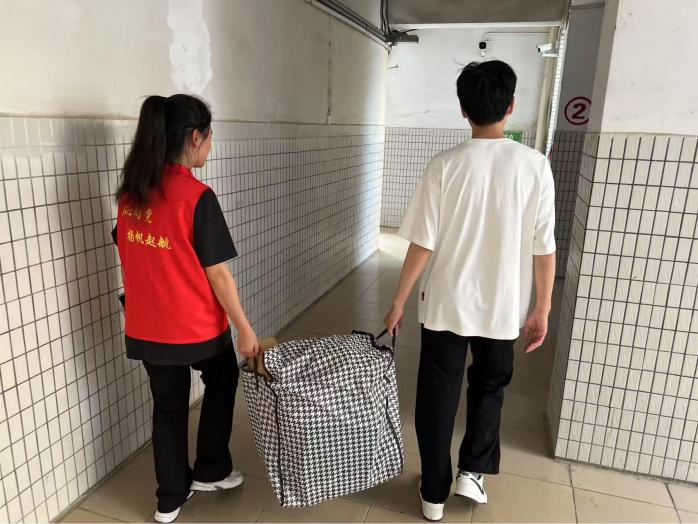 阳光下,志愿者们的身影忙碌而坚定。他们的汗水滑过额角,弯腰托举的动作却没有丝毫怠慢,每一个动作都沉稳有力,笑容不减,只为送毕业生安心启程。