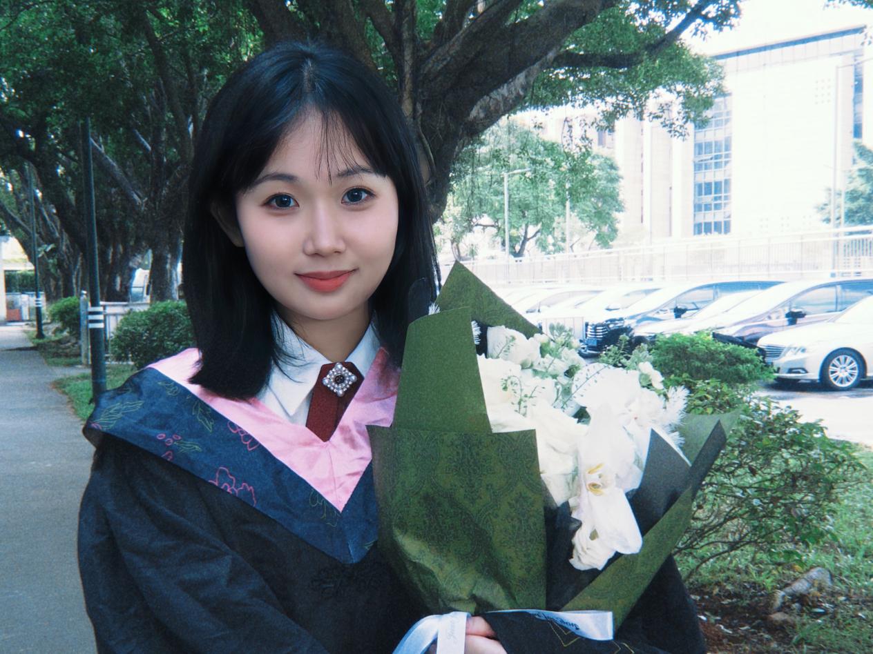 毕业寄语:亲爱的学妹学弟们好,在这场人生的旅途中,没有绝对的起点或终点。祝你们都能找到自己的理想信念目标,并为之所奋斗。祝愿你们都能够在今后的日子里,爱自己,找到自己,并成为自己。
