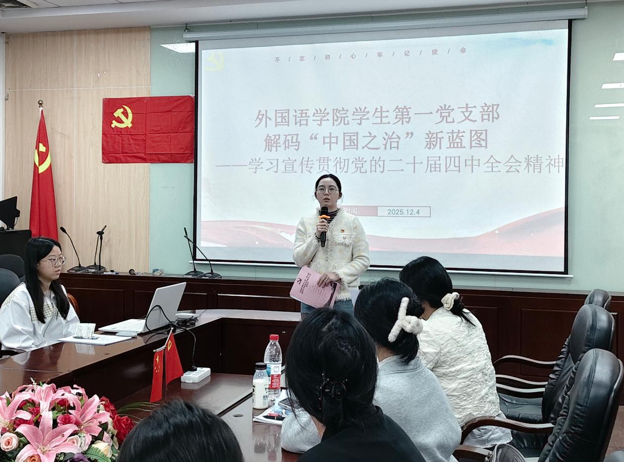 陈震枫首先阐述了学习的时代坐标与支部使命。他指出,党的二十届四中全会审议通过《中共中央关于制定国民经济和社会发展第十五个五年规划的建议》,为“中国之治”绘就了新蓝图。他强调,作为以党员为核心的员工组织,员工党支部肩负着将全会精神转化为服务同学行动力的核心使命,要发挥“头雁效应”,连接“国家蓝图”与“校园实践”,引领青年在理解制度优势中增强认同,在参与实践中锤炼能力。